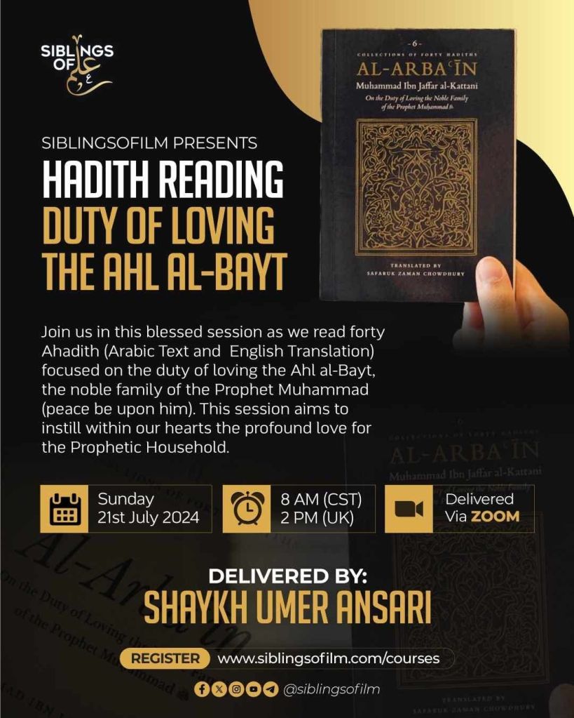 Hadith Hadith Reading: Duty of Loving the Ahl al-Bayt July 20, 2024July 20, 2024 Umer Ansari In collaboration with the Siblingsofilm UK, I will be reading the 40 Hadith on the Duty of Loving the Ahl al-Bayt with brief comments. Share this: Share on X (Opens in new window) X Share on Facebook (Opens in new window) Facebook Email a link to a friend (Opens in new window) Email Share on WhatsApp (Opens in new window) WhatsApp Share on Tumblr (Opens in new window) Tumblr Share on Reddit (Opens in new window) Reddit Like Loading... Share this: Share on X (Opens in new window) X Share on Facebook (Opens in new window) Facebook Email a link to a friend (Opens in new window) Email Share on WhatsApp (Opens in new window) WhatsApp Share on Tumblr (Opens in new window) Tumblr Share on Reddit (Opens in new window) Reddit Like Loading...